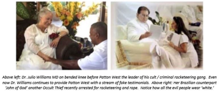 On the 25 February 2021, Watson sent a detailed letter to Dr. Julio E Williams (with copies to the FBI and the police) detailing the ongoing campaign of intimidation being directed at him, his wife and children by Patton West. Watson also asked Williams why, after receiving 500 plus emails complaining about this intimidation, did Williams not pass these emails to the authorities? Well, the obvious answer is that Dr. Julio E Williams MD is a 20 year student and apprentice of Patton West’s unaccredited school for occult studies, as well as being a senior member of her cult / criminal racketeering gang. Dr. Williams has also pledged millions of dollars to cover his cult leader’s legal costs, as is made clear by a threatening expletive laden email Williams sent to Watson in January 2007.