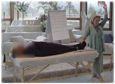 Above: Devra West extracting millions of dollars from a wealthy heiresses who she convinced owed her from a previous lifetime. With others she just promises to remove bad karma for a very large fee!